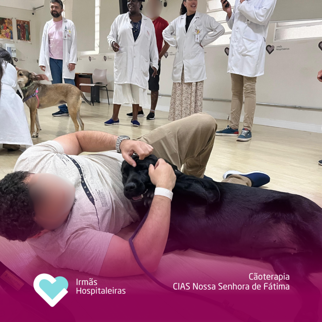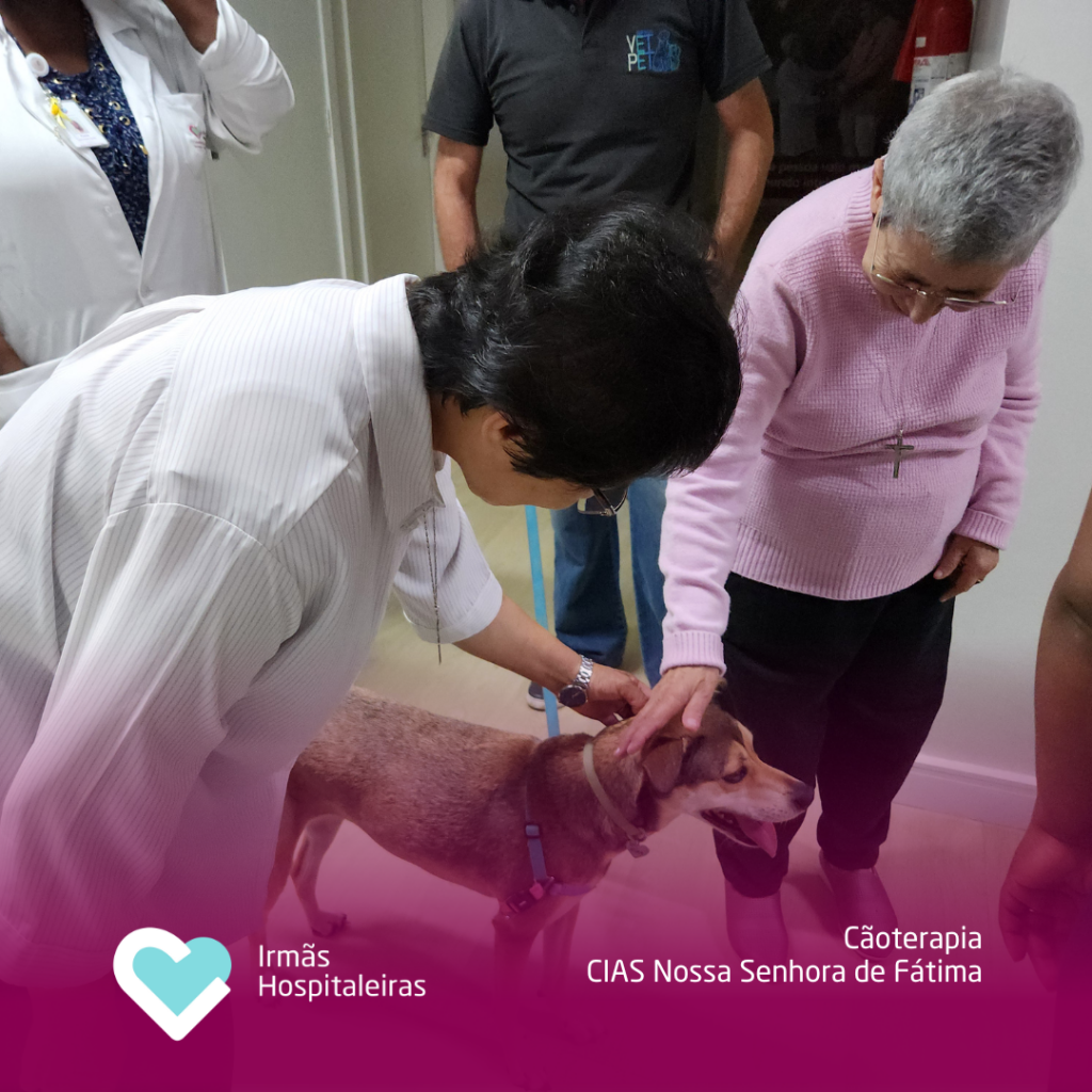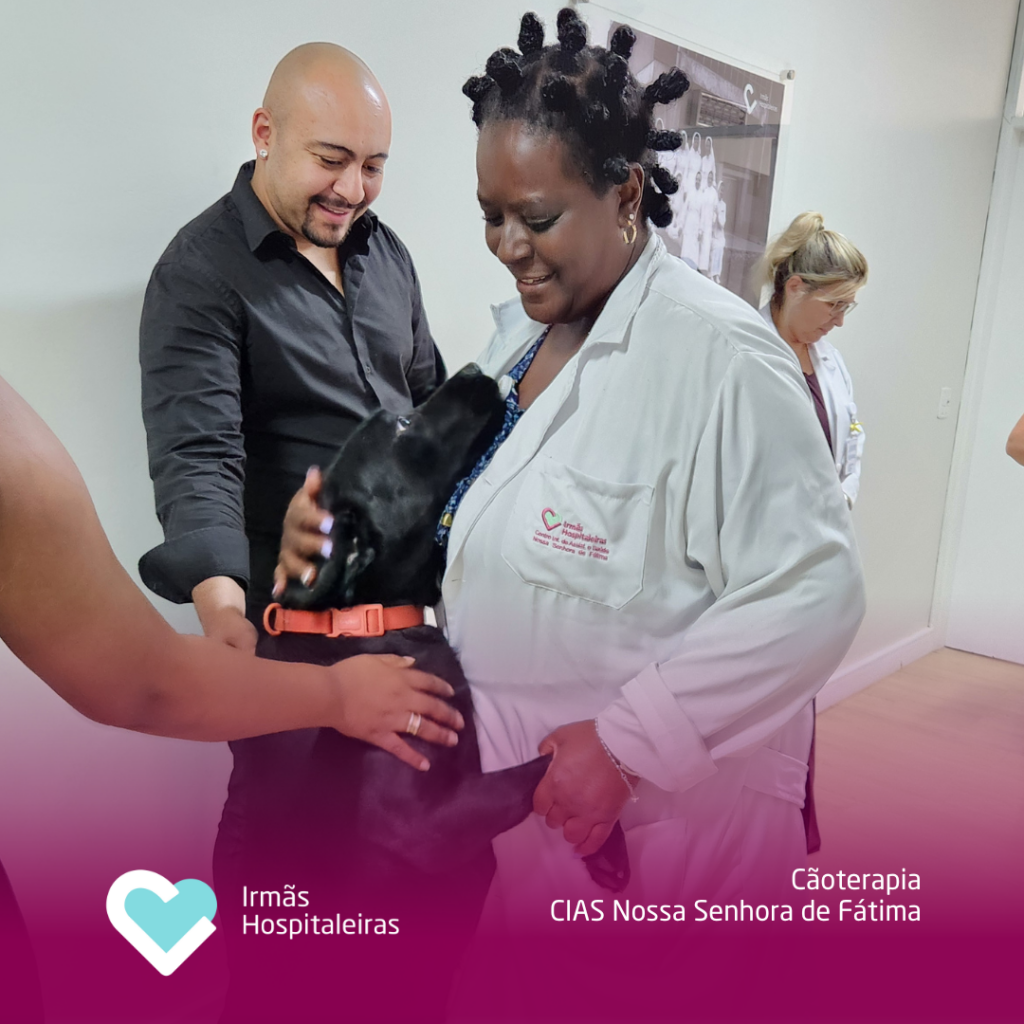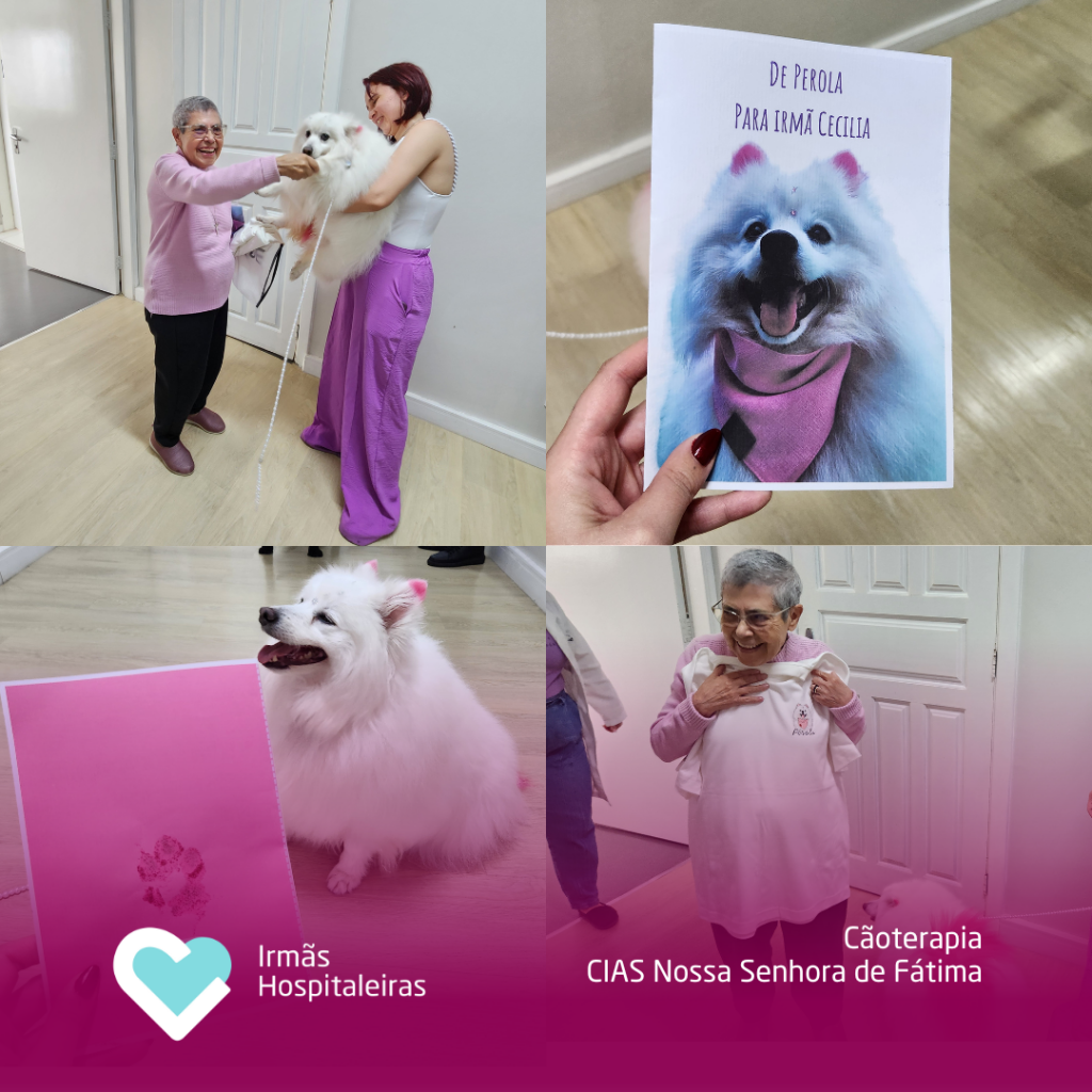 A cãoterapia trouxe alegria e muitos sorrisos para nossos pacientes e colaboradores. A Pérola, uma das nossas fiéis companheiras, também fez questão de demonstrar seu carinho com um presente especial para a Irmã Cecília.