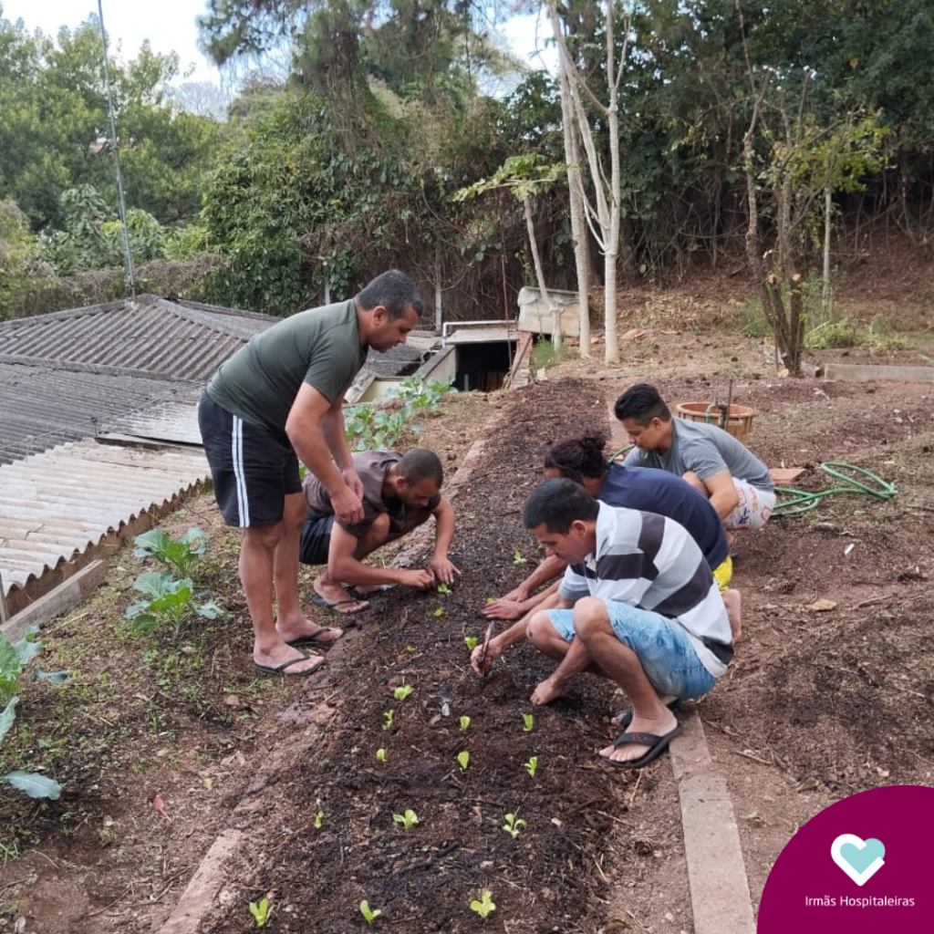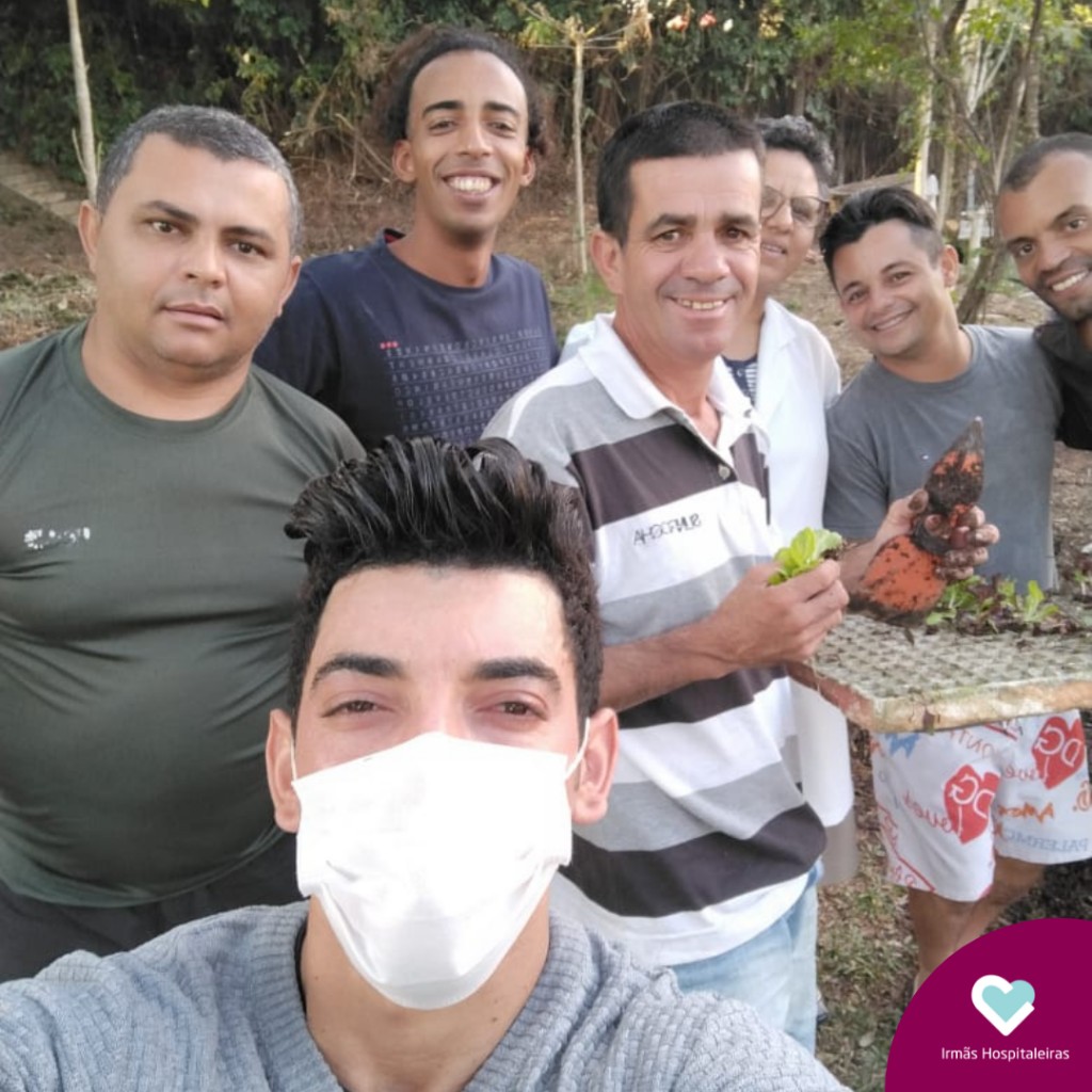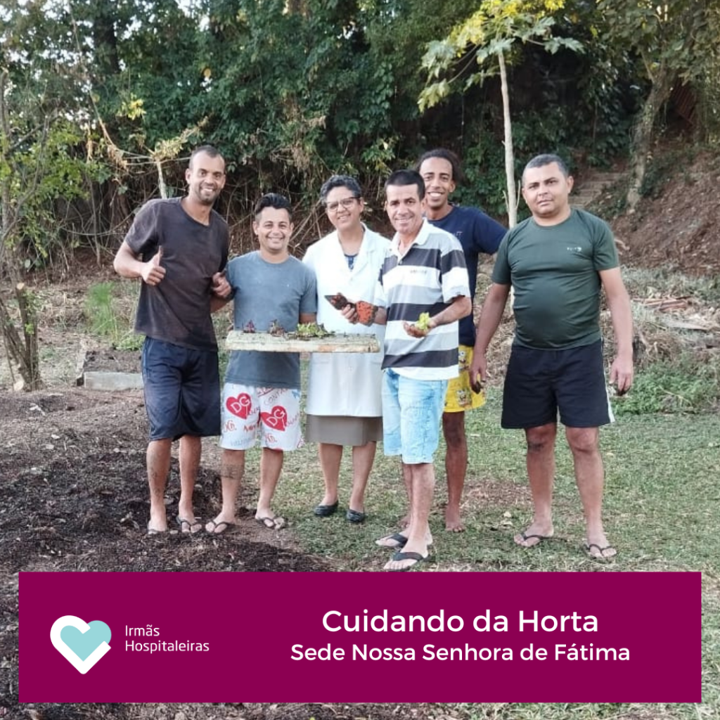 Nesta semana, alguns pacientes da sede Nossa Senhora de Fátima colocaram muito empenho no cuidado com a horta, com a supervisão dos membros da equipe de enfermagem, irmã Regiane e Jardel.
