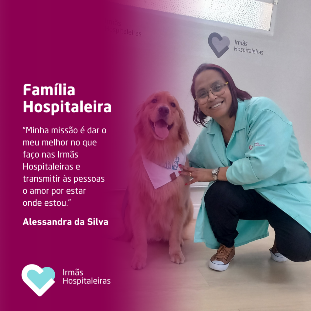 Alessandra da Silva é auxiliar de recreação e faz parte das Irmãs Hospitaleiras há 17 anos, sempre dedicada a oferecer o melhor atendimento e cuidado aos pacientes. No tempo livre, gosta de estar com a família, praticar atividades físicas e se dedicar ao artesanato. Apaixonada pelo que faz, Alessandra reflete amor e compromisso em cada detalhe de sua missão.