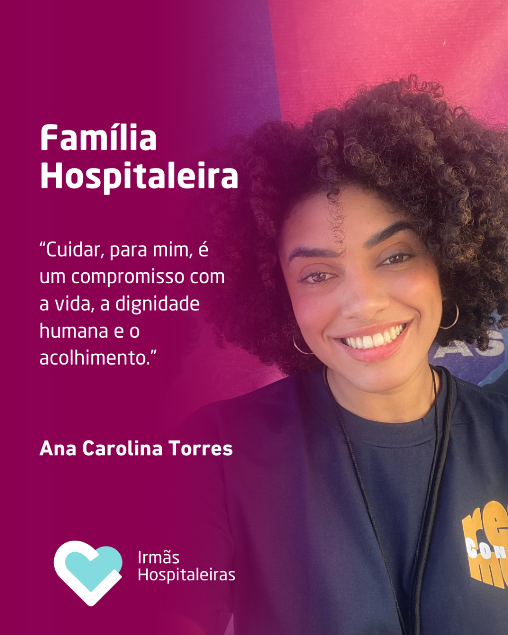 Ana Carolina Torres é enfermeira do CAPS Adulto III Parelheiros e faz parte das Irmãs Hospitaleiras há 7 anos. Sua trajetória é marcada pelo amor ao cuidado em saúde mental, pelo compromisso com a vida e pela valorização da dignidade humana, vivenciando na prática o carisma da hospitalidade.