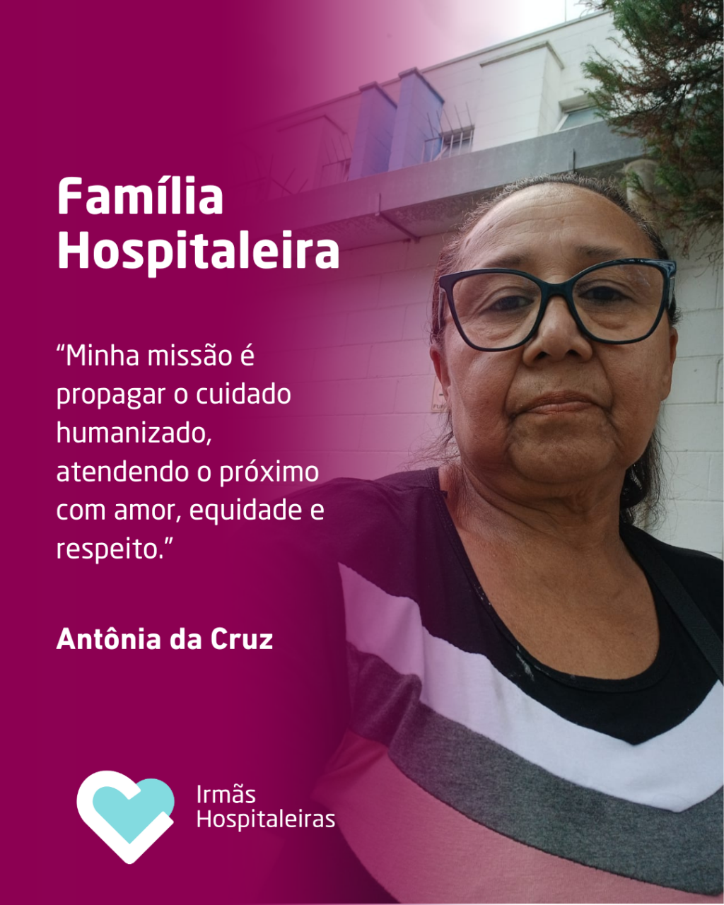 Antônia da Cruz é Auxiliar de Enfermagem na Casa de Saúde Nossa Senhora de Fátima e faz parte das Irmãs Hospitaleiras há 33 anos. Sua trajetória é marcada pela dedicação, superação e pelo cuidado humanizado com cada pessoa atendida.