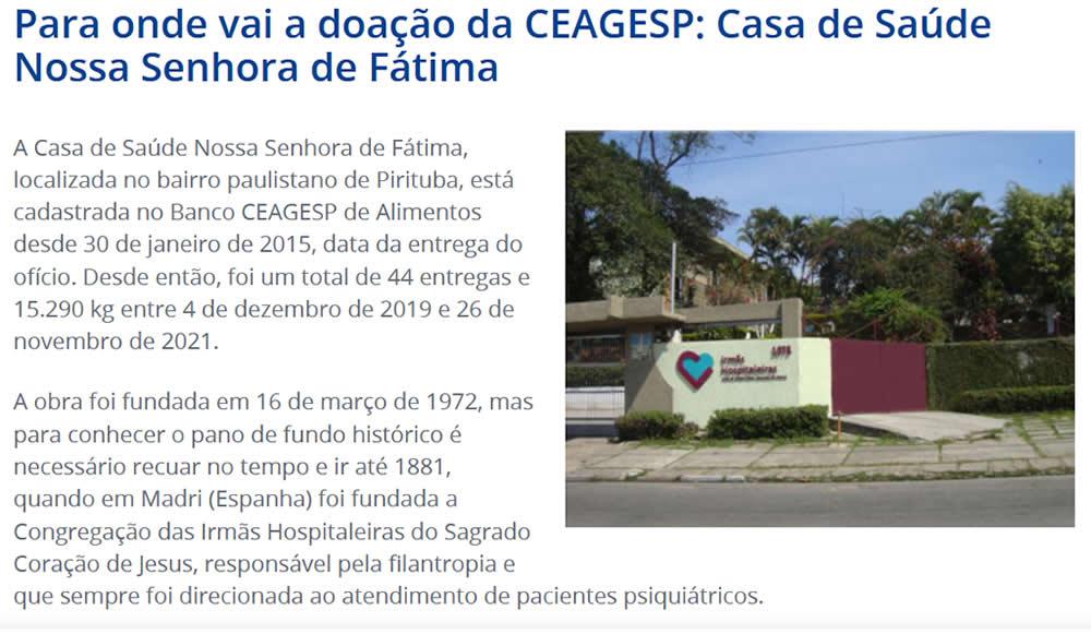 A Casa de Saúde Nossa Senhora de Fátima, localizada no bairro paulistano de Pirituba, está cadastrada no Banco CEAGESP de Alimentos desde 30 de janeiro de 2015, data da entrega do ofício. Desde então, foi um total de 44 entregas e 15.290 kg entre 4 de dezembro de 2019 e 26 de novembro de 2021.