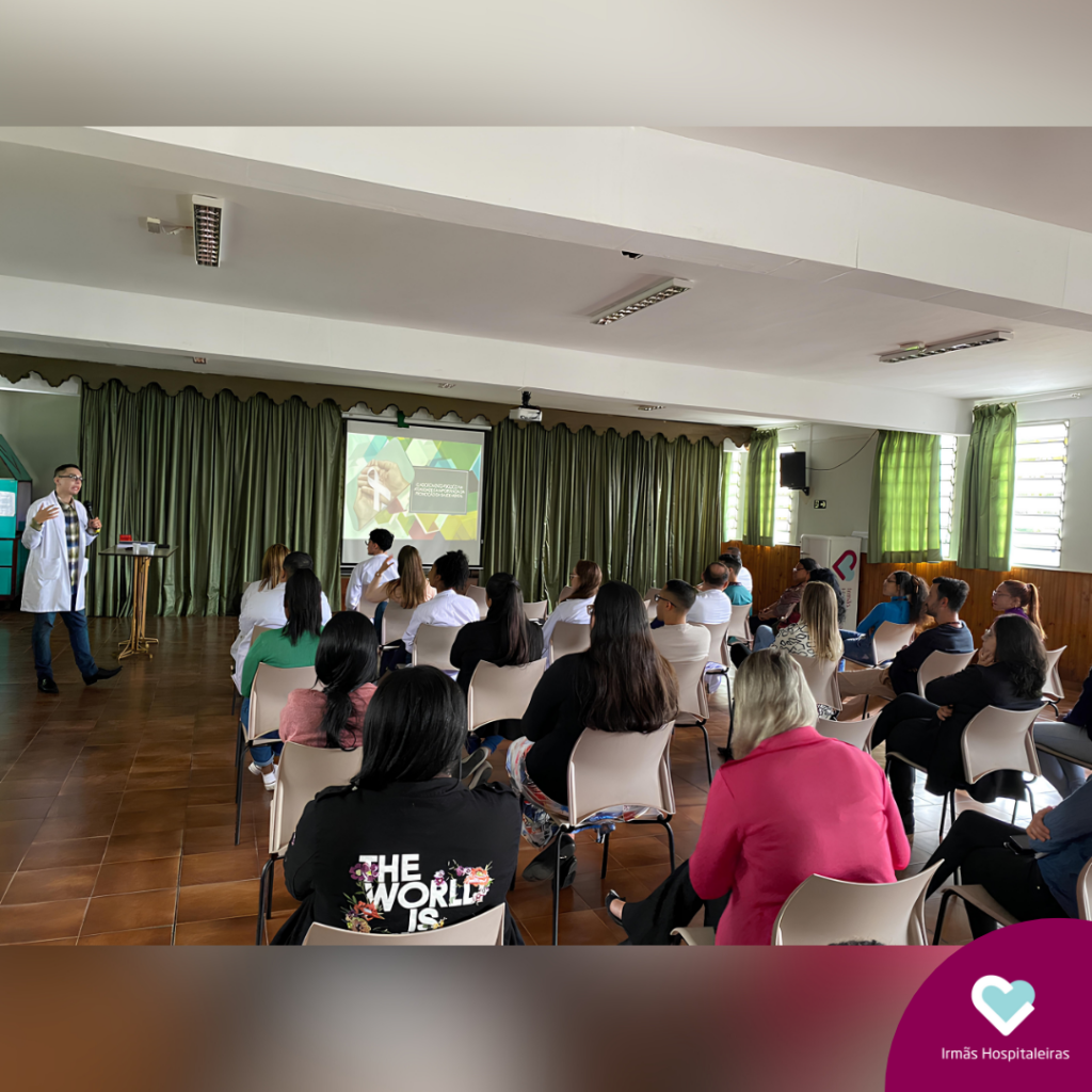 Todos os meses, os colaboradores do CIAS Nossa Senhora de Fátima se reúnem para assistir uma palestra sobre um tema de relevância na área da saúde, além de outros temas de relevância social.
