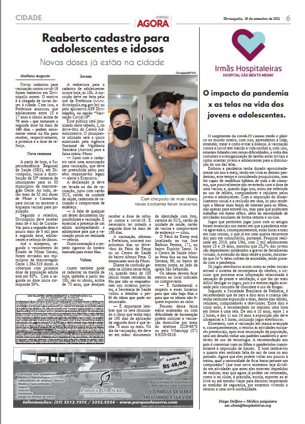 Publicação do Hospital São Bento Menni em Jornal Agora. Tema: impacto da pandemia x as telas na vida dos jovens e adolescentes. Por dr. Diego Delfino.